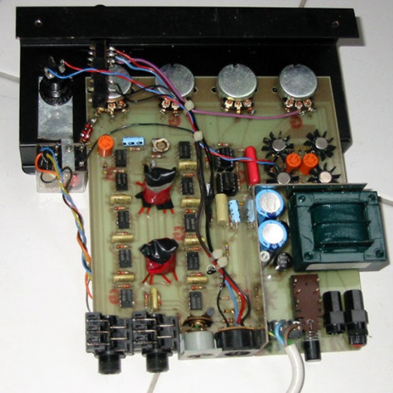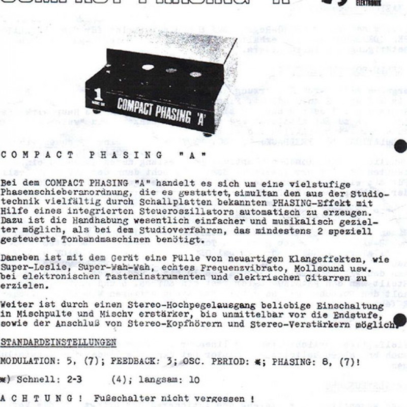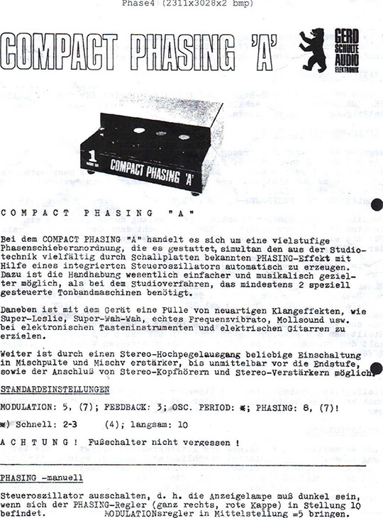 In the background you can see the AIWA tape recorder, with the german Schulte "Compact Phasing A" phaser on top. This was an 8-stage phaser built in Berlin/Germany, similar to the 6-stage MuTron phaser. You can hear this unit on “Catch the Rainbow”. Another excellent example for the use of this phaser, is the 1974 “Autobahn” album from the German band “Kraftwerk” .py, the first German band ever who was able to place a record in the US charts - it was exactly this album! Another excellent example is the 1977 “Mirage” album from German avant-garde synthesizer player Klaus Schulze.