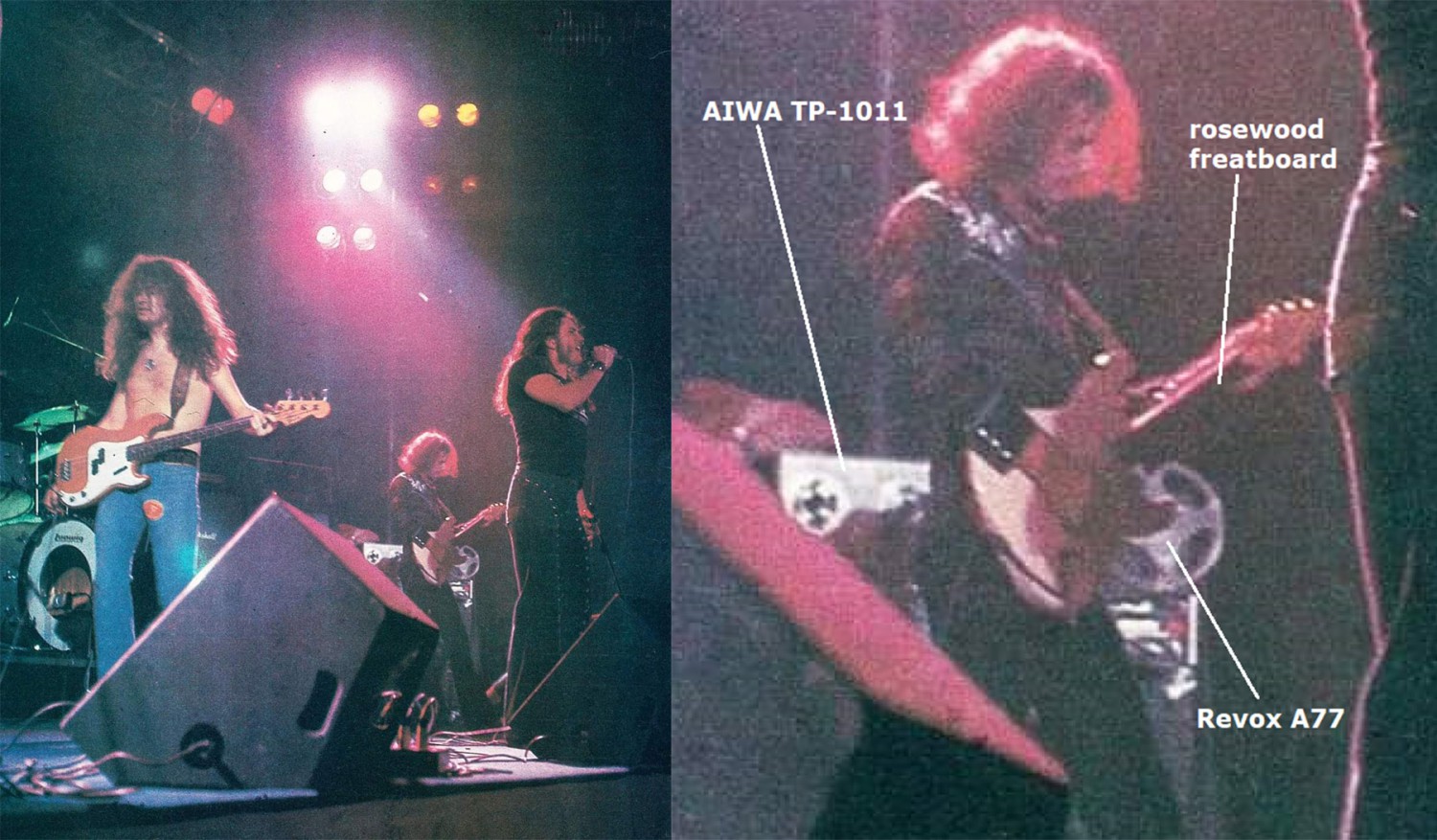 From December 1973, at the beginning of the “Burn”-Tour in Northern Europe, Ritchie used a partly new live setup: the preamp of his Marshall Major amps were now modified, the treble boosters were retired and replaced with his famous AIWA TP-1011 reel-to-reel recorder, built in December 1970 both as a booster and a delay effect. For his studio work Ritchie also started to use the AIWA machine as a booster accompanied by lots of other gear, including his treble boosters. A few years later in his Rainbow days he began to use it regularly.