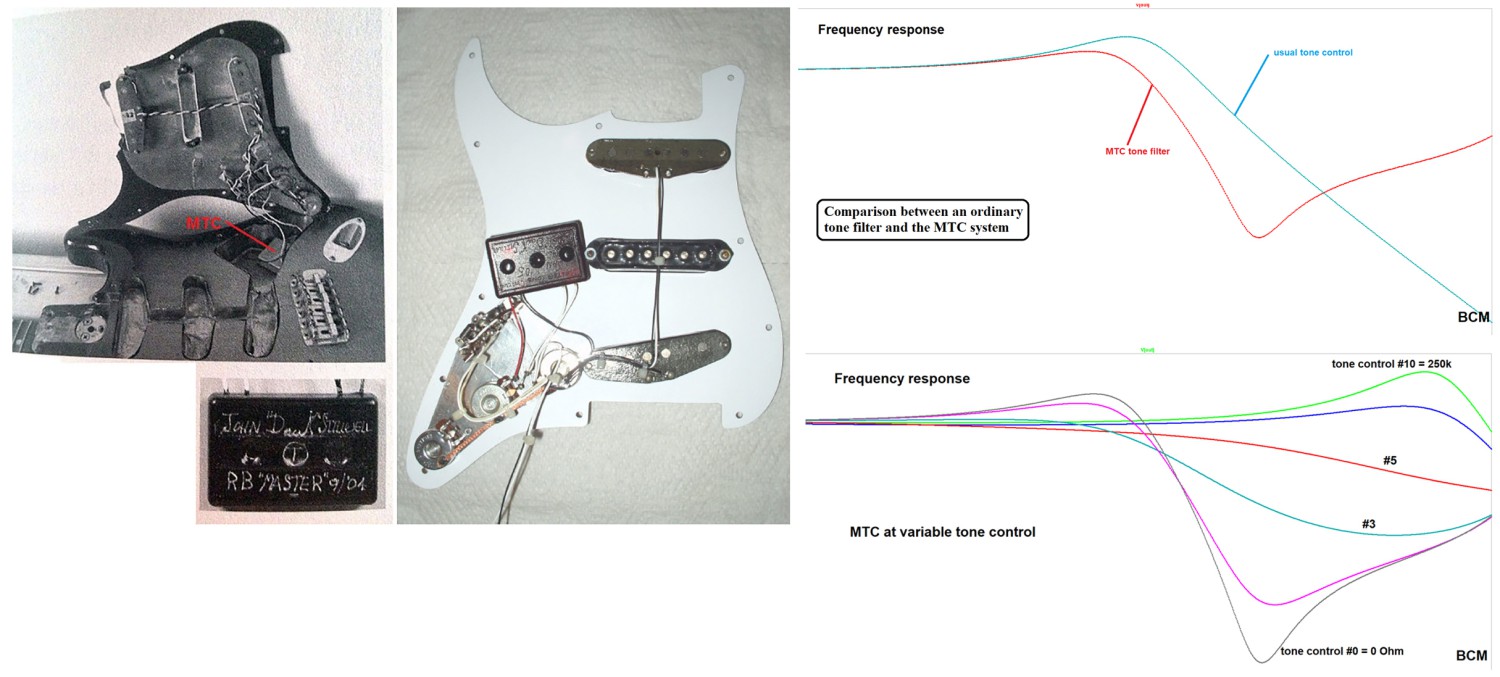 In mid 1978 Ritchie started to use his first hum cancelling Stratocaster (1977er Olympic-white, Serial number: S778960), designed and built by his tech. Ritchie also wanted a more modern sound, and finally he choose the “Velvet Hammer” pickups (VHS-2 model, 6kOhm DC-R) from Red Rhodes, a high quality slightly overwound Fender style pickups. The slightly increased output of these pickups was not the main reason for Ritchie’s choice, because the preamp stage of his AIWA still had plenty of gain. In the middle position of the pickguard, Ritchie´s tech installed the VHS-2-R model (the “R” after the model name characterized the reverse wound type of the model line VHS-2 and was designed for the middle position in Stratocasters) as a dummy coil construction, so together with the bridge or neck pickup, Ritchie received a humbucking effect. The dummy coil was a demagnetisized VHS-2-R pickup. Furthermore this axe was probably the first of his guitars equipped with his techs so called Master-Tone-Circuit (MTC) with which Ritchie was able to get a creamier lead tone, if he wanted to. All of Ritchie’s following Strats will have the MTC build in.