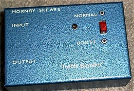The famous Hornby-Skewes Treble Booster, used by Ritchie Blackmore. Originally the booster was part of the "ZONK Machine Set", a set of two stompboxes: a Booster and a Fuzz. Ritchie Blackmore only played the booster, same with Martin Barre & Andy Scott. The fuzz box was a very close clone of the Maestro FZ-1A (well-known because of the sound of "Satisfaction" from the Rolling Stones), not very popular at this time, but at least you can hear it on some songs from Mark Bolan (T. Rex), eg. on the pretty cool "Electric Warrior" album from 1971.