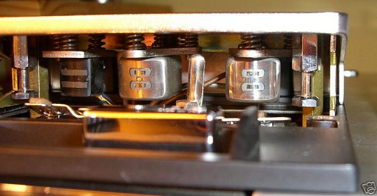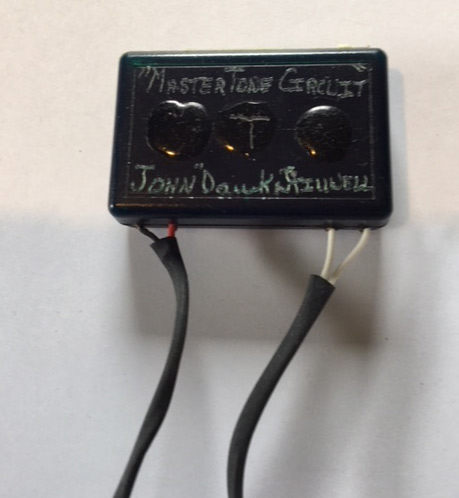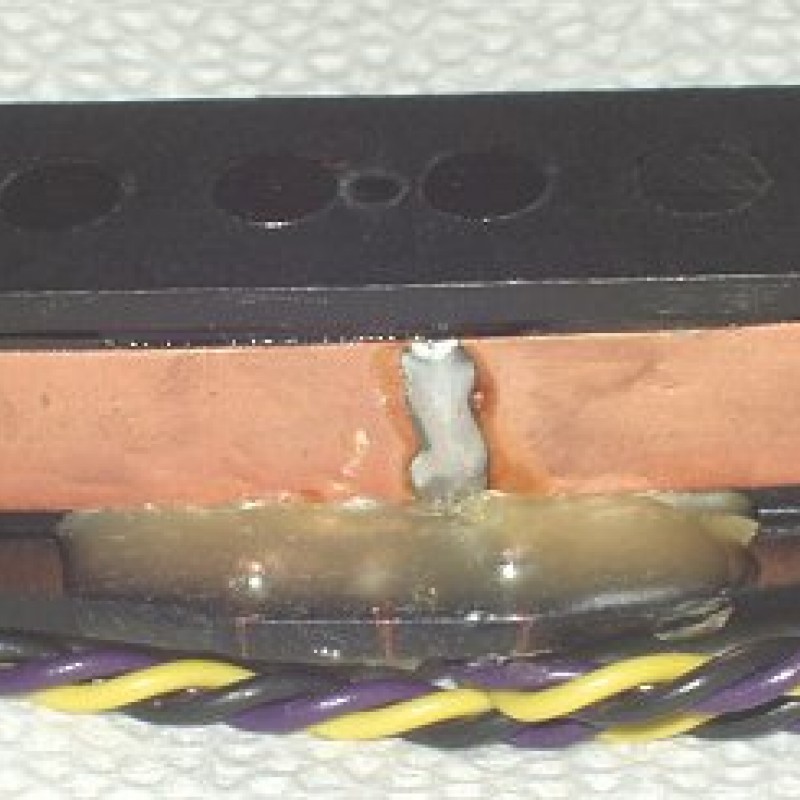 Ritchie still had his problems with the F500T Stratocaster, because a pickup installed at the neck position is always a tad louder than a pickup in the bridge position. Ritchie really loved the warm full tone of his neck pickup, but the bridge pickup was too thin and punchless for the fat lead-sound he had in mind. To solve this problem, the F500T pickup was soldered for full gain after a short time. To prevent the pickup from getting louder as intended, it was lowered to increase its distance from the strings (see pic). Ritchie was very glad about the sound of this Strat now, but this procedure also created an unwanted side-effect. For perfect hum bucking, both coils have to be as close as possible plus they should have the same number of windings! The dummy-coil was developed and balanced for the neck pickup (and of course for the bridge pickup before this procedure), but it was too weak now for the bridge pickup with full gain ... it was simply underwound. Furthermore, when combining a pickup with a dummy-coil, the inductance of both is added to each other, which means a noticeable treble loss. The neck pickup together with the dummy-coil sounded awesome and was almost hum-free, but using a fatter dummy-coil together with the bridge pickup was over the top, the sound was very dull, loosing all the top-end and bite, and Ritchie was unhappy again. To get rid of the treble loss, the original dummy-coil for the neck pickup was used for the bridge pickup again. The top-end came back, but now the bridge pickup produced noticeably more hum than the neck pickup. Ritchie could live with that, but he was not very happy about it. For a short time, Ritchie used a modified modern 5-way pickup selector switch, to toggle between the bridge pickup’s full and half winding, but this did not last long, because Ritchie was used to simply flip the switch between the two outer positions, he did not like to mess around with the in-between positions of a 5-way switch.