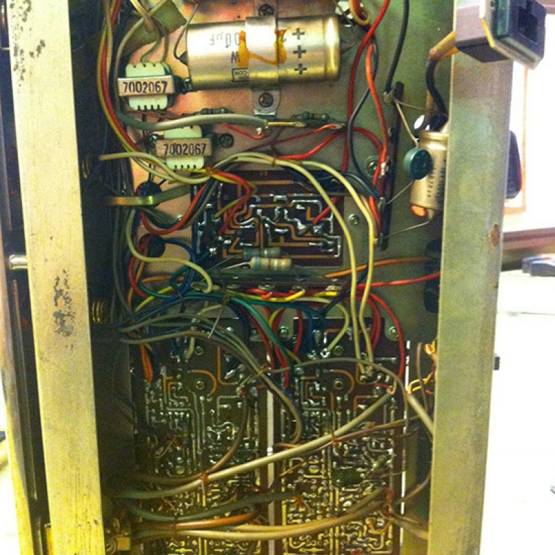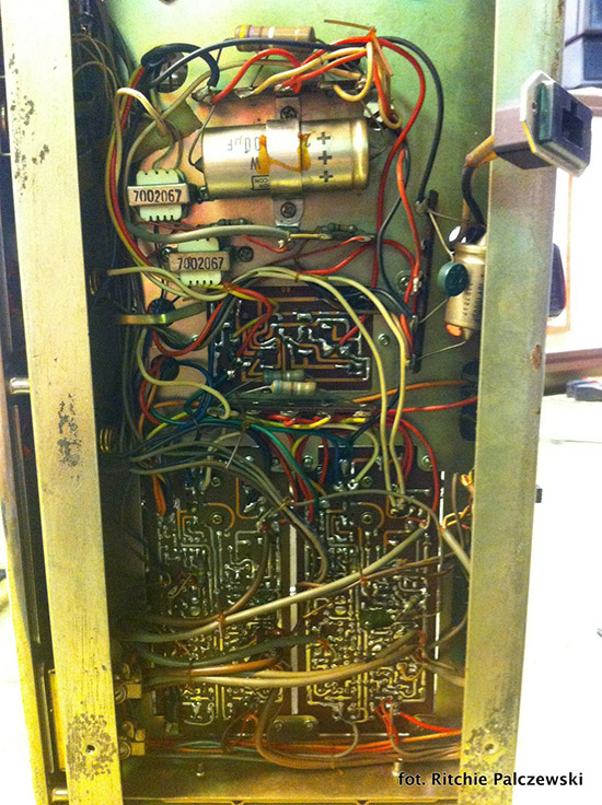 During the “Burn” Session Ritchie became very creative with his gear and used everything he liked. Now he was without restrictions the leader from Deep Purple Mk3 and could experiment with whatever he wanted. Besides his trebleboosters Ritchie used different amps, even a small car-battery powered transistor amp (“Sail Away”) out of the recording studios junk room. Furthermore the EMS Hi-Fli (an early guitar synthesizer on “Sail away”, contains such effects like treble booster, fuzz, octave fuzz, sustain fuzz, vibrato, phasing, chorus, standard & special wah-wah (eg. with six resonant peaks), ring-modulator, and other features) and especially the German Schulte Compact Phaser “A” came into operation.