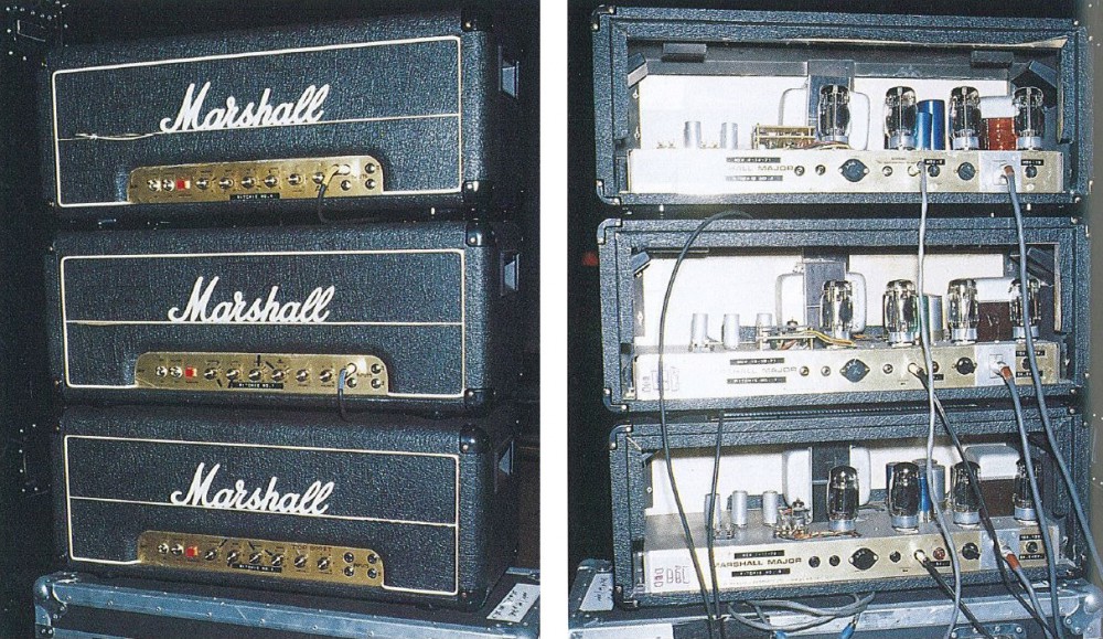 Ritchie's amps in late Rainbow, now in the short lived white tolex cover from – Bent out of shape - tour in 1984. The amp No. 2 (an early Major from the first series) was missing since the DP_Mk3 period. For a few years, it appears again and was sold for great money. The amp No. 1 & Nr. 4 was used in autumn 1972 in legendary Deep Purple Mk2, “Made in Japan” live records. The amp No.3 was fitted with an extra “top boost” feature and was also used as master amp during DP_Mk3 period. You can hear the “razor-blade” sound in DP Mk3 – “live in London” 1974. Later, you can hear this No.3 amp with a slightly preamp mod from Ritchie´s tech in “Rockpalast” show Munich 1977.