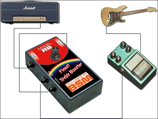 Good news for all Ritchie Blackmore fans. The high output level of his treble-booster often causes problems with the following modulation-unit, especially with the echo-unit that is necessary and important for the real post 74' Blackmore sound. BSM solved this problem with the brandnew RB box (aka Ritchie's box ?!?), a pure passive looper with two special line-transformers. In the first step the input level is lowered to approx. 50% to have the standard level for overdrive-free processing in other effects. In the second step the signal is pushed up again to 100% in the Return-Section up to the original output-level. With this tricky thing it's also possible to combine todays modelling-effects and old-style treble-boosters! The RB box works absolutely passive while the top-notch transformers will add those analog flair of Ritchies AIWA to all digital echo- and delay machines (recommended: Boss DD-3). With some tricky backward-wiring you can also use the transformers to push any connected stompbox (eg. an overdrive) to twice or fourth of it's original output to reach the output level of a treble-booster with the benefit of it's mild and soft characteristics.